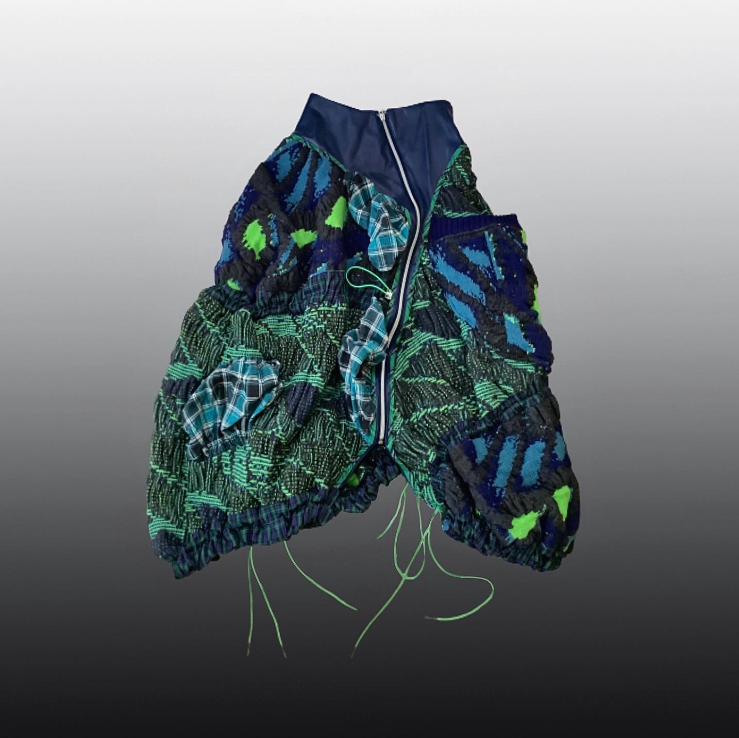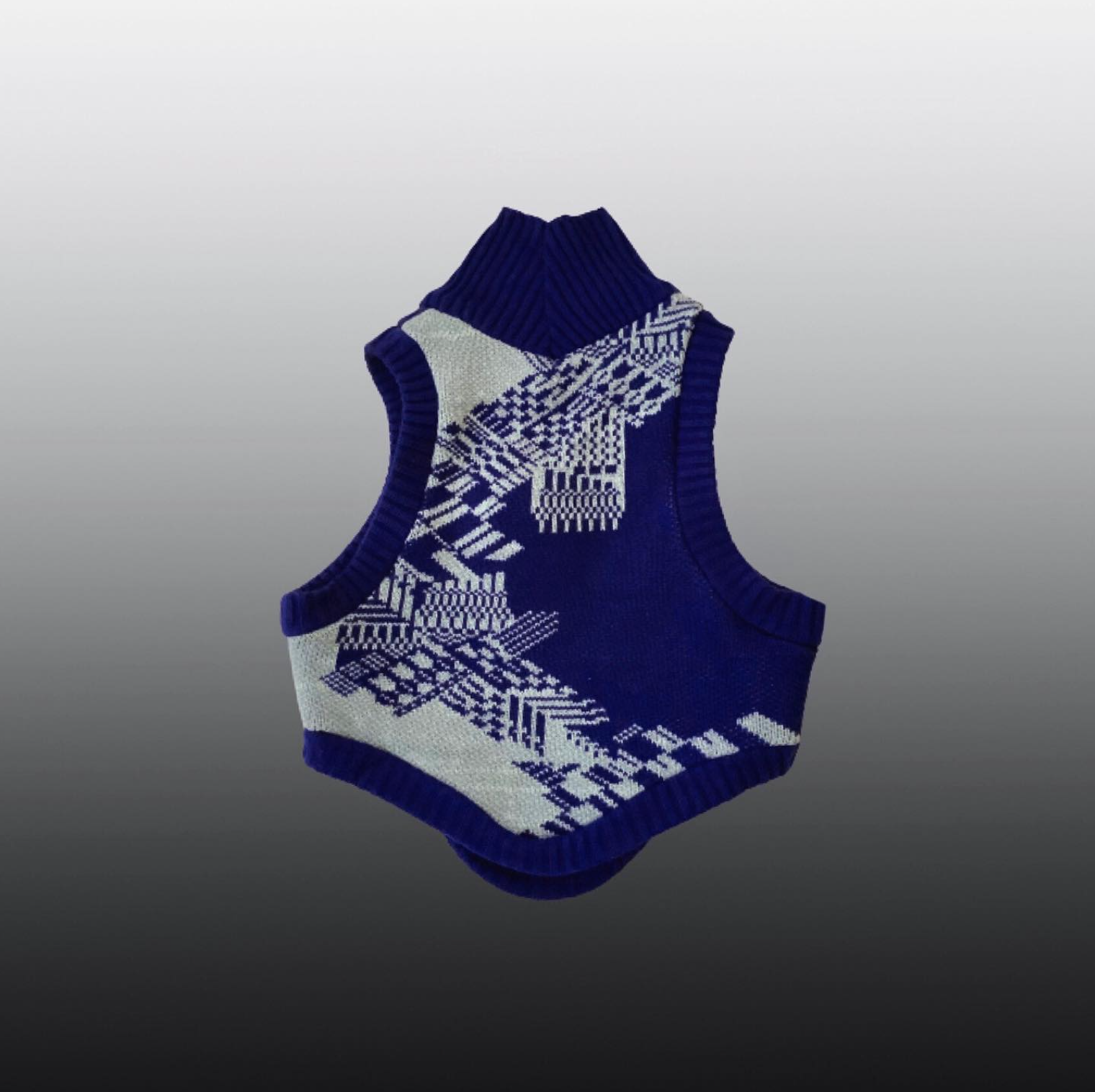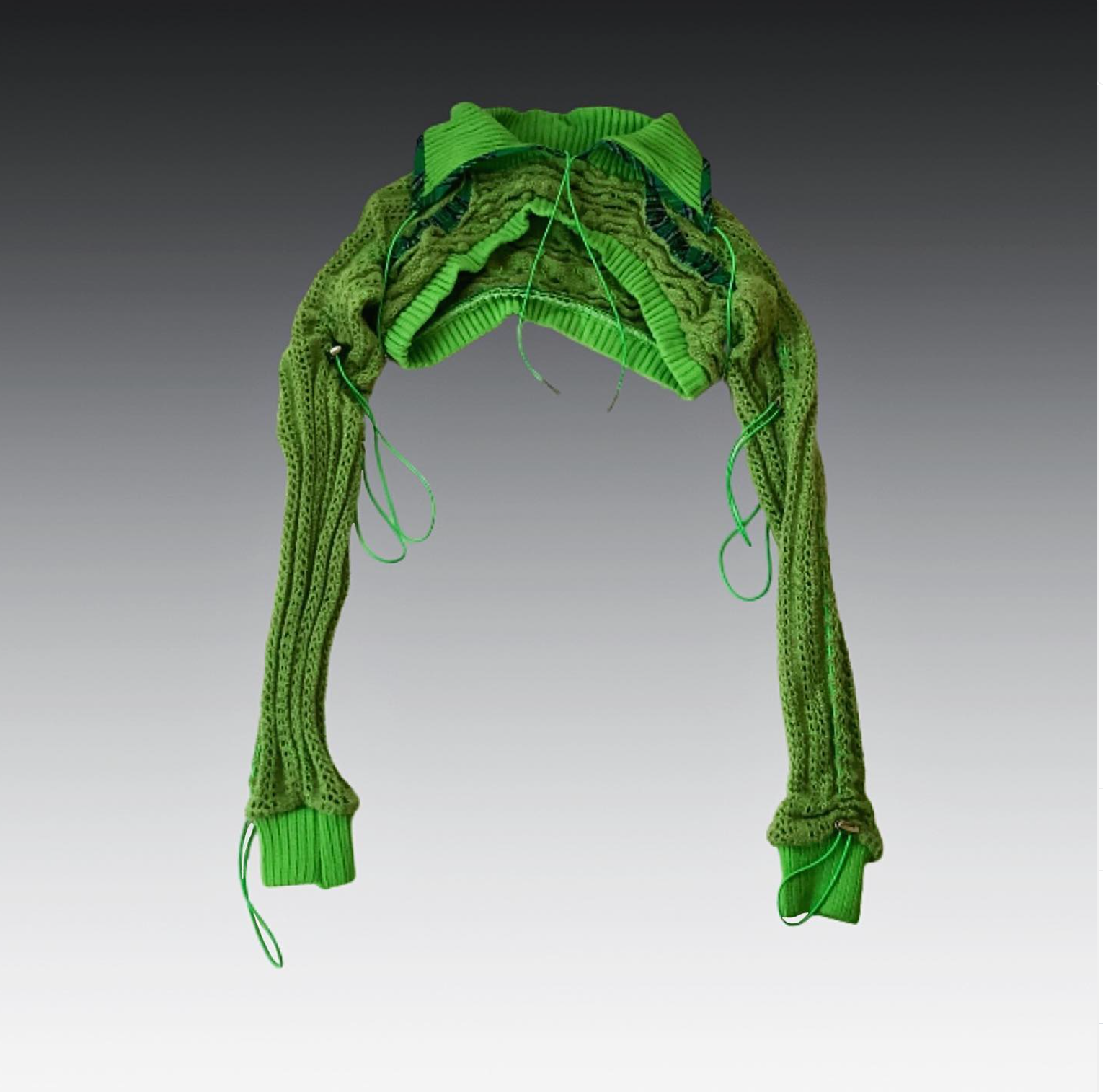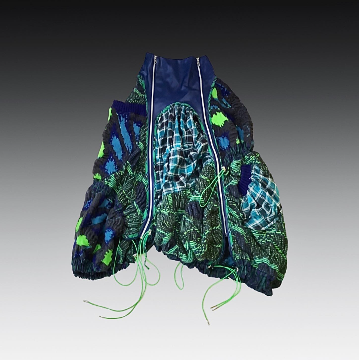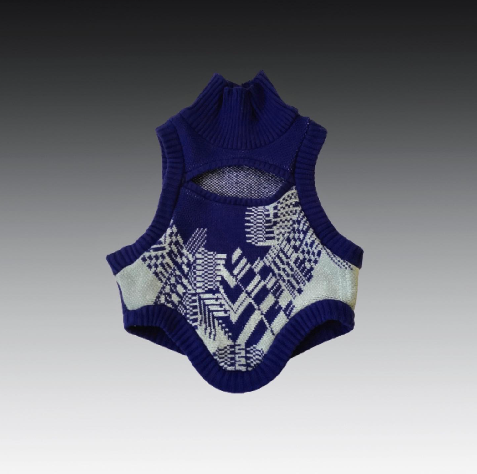 Through the combination of varied knitting techniques and synthetic PU panels, the project creates tension between softness and structure, skin and artificial support. Construction details such as exposed zippers and fabric bindings are deliberately revealed, presenting the garment as an assembled object—fragmented, modular, and under examination.
